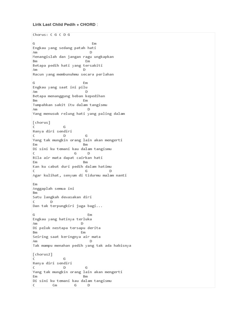 G em engkau yang saat ini pilu engkau yang saat ini pilu am d betapa menanggung beban kepedihan bm em. Berikut chord 'pedih', lagu yang ada di album pertama last child yang bertajuk grow up dirilis pada 2007. Minggu, 16 februari 2020 22:40 wib Minggu, 22 november 2020 21:01 wib. intro c g c d g g engkau yang sedang em patah hati am menangislah dan jangan d ragu ungkapkan bm betapa pedih hati em yang tersakiti am racun yang membunuhmu d secara perlahan g em engkau yang saat ini pilu (engkau yang saat ini pilu) am d betapa menanggung beban kepedihan bm tumpahkan.